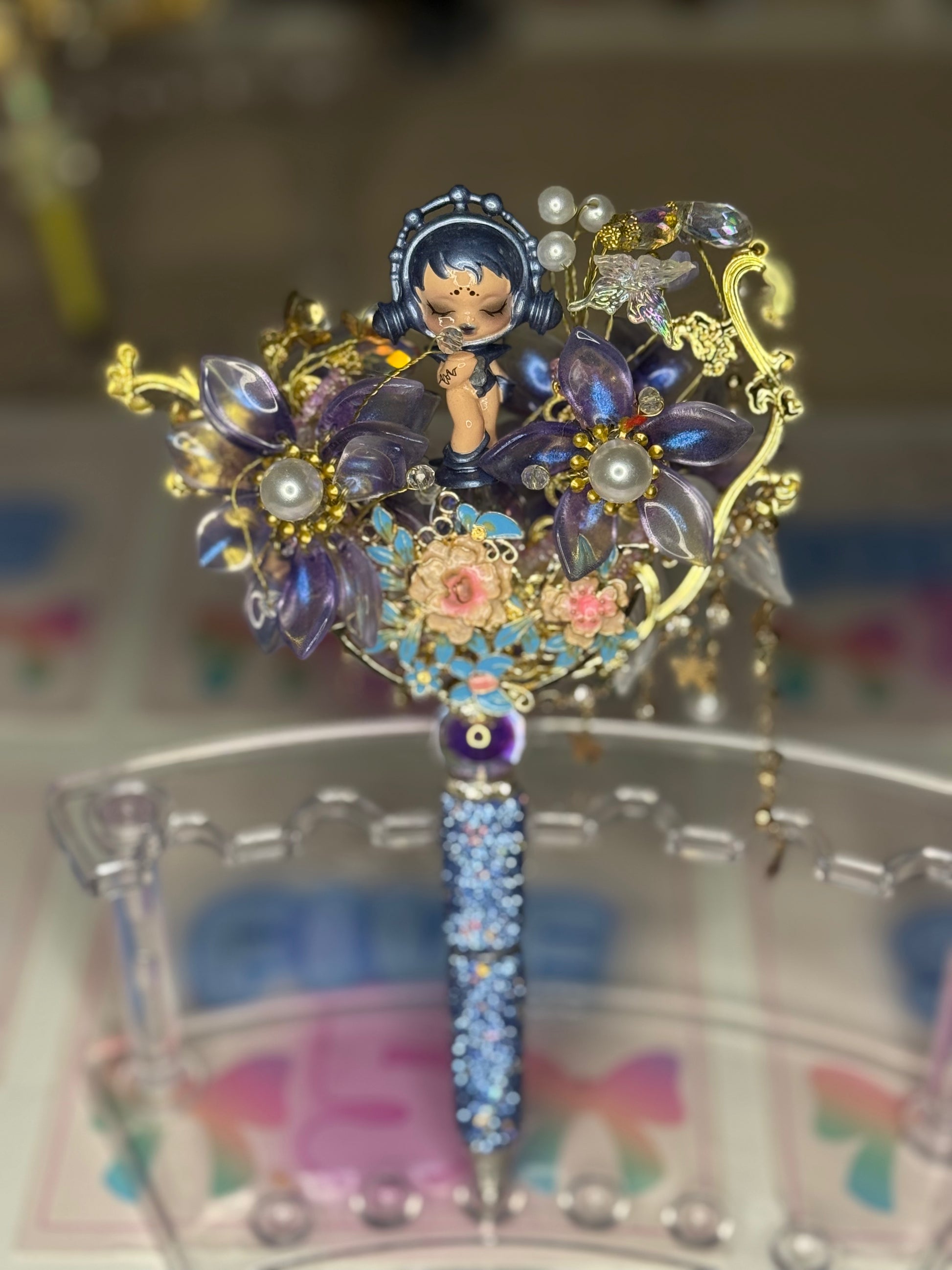 She sits on a blue rhinestone pen barrel and surrounded by a metallic half moon and glass lotus flowers.