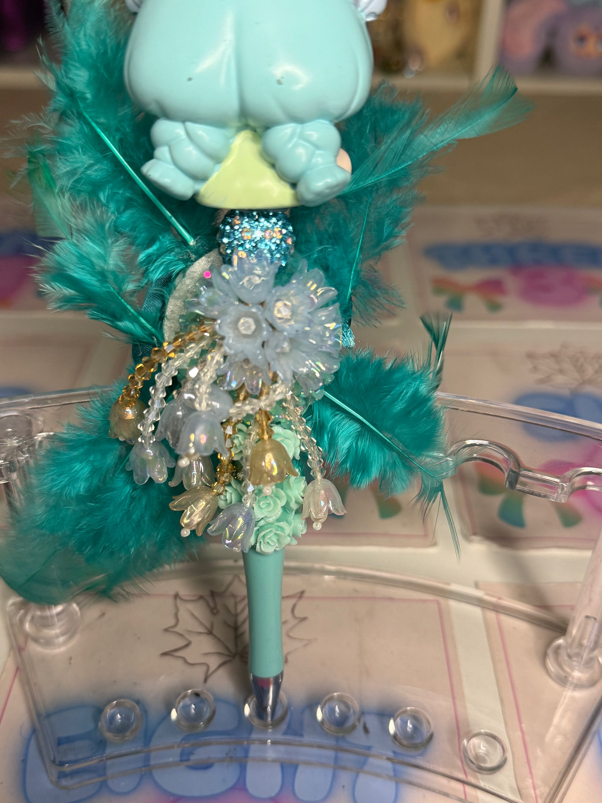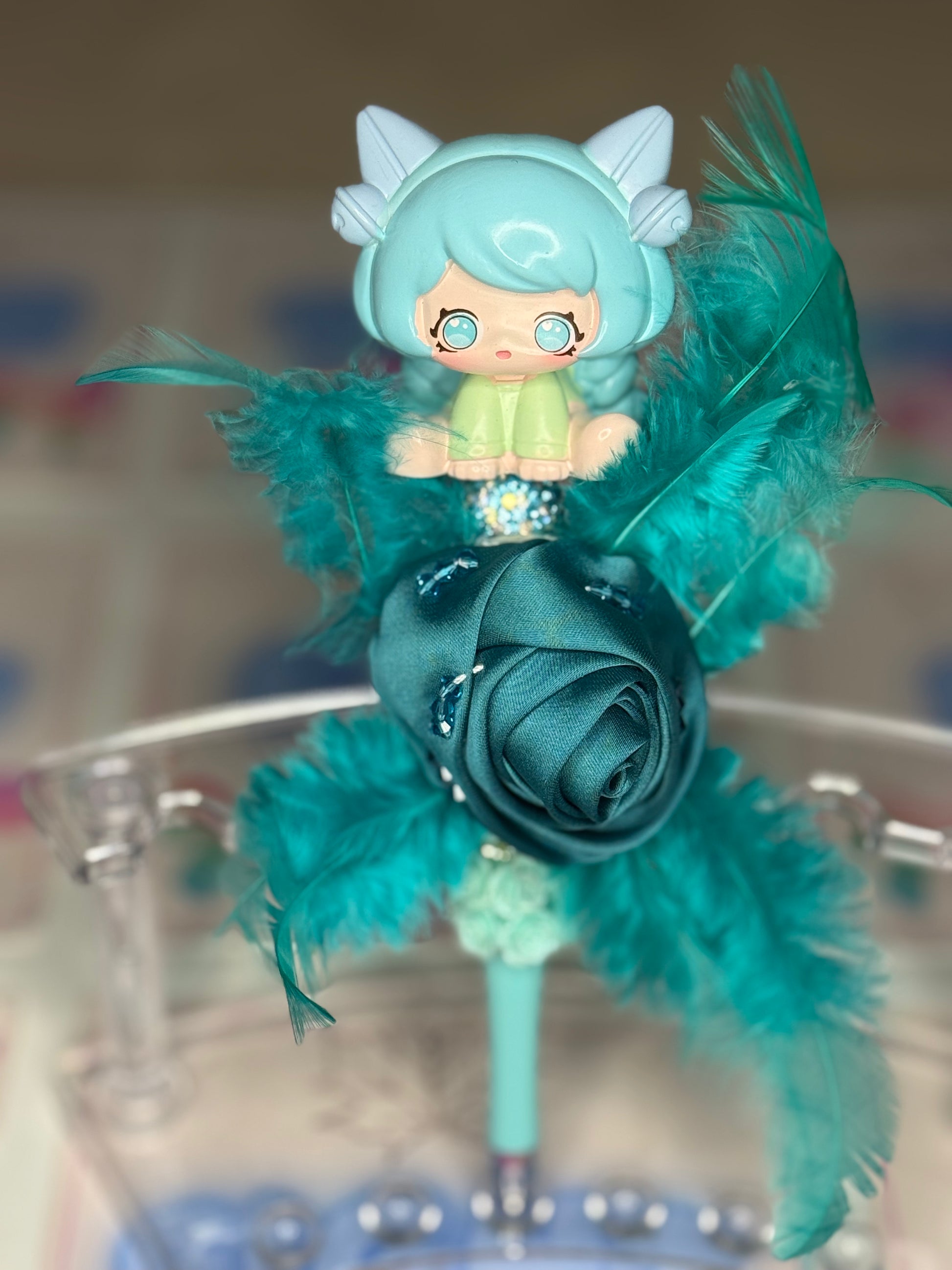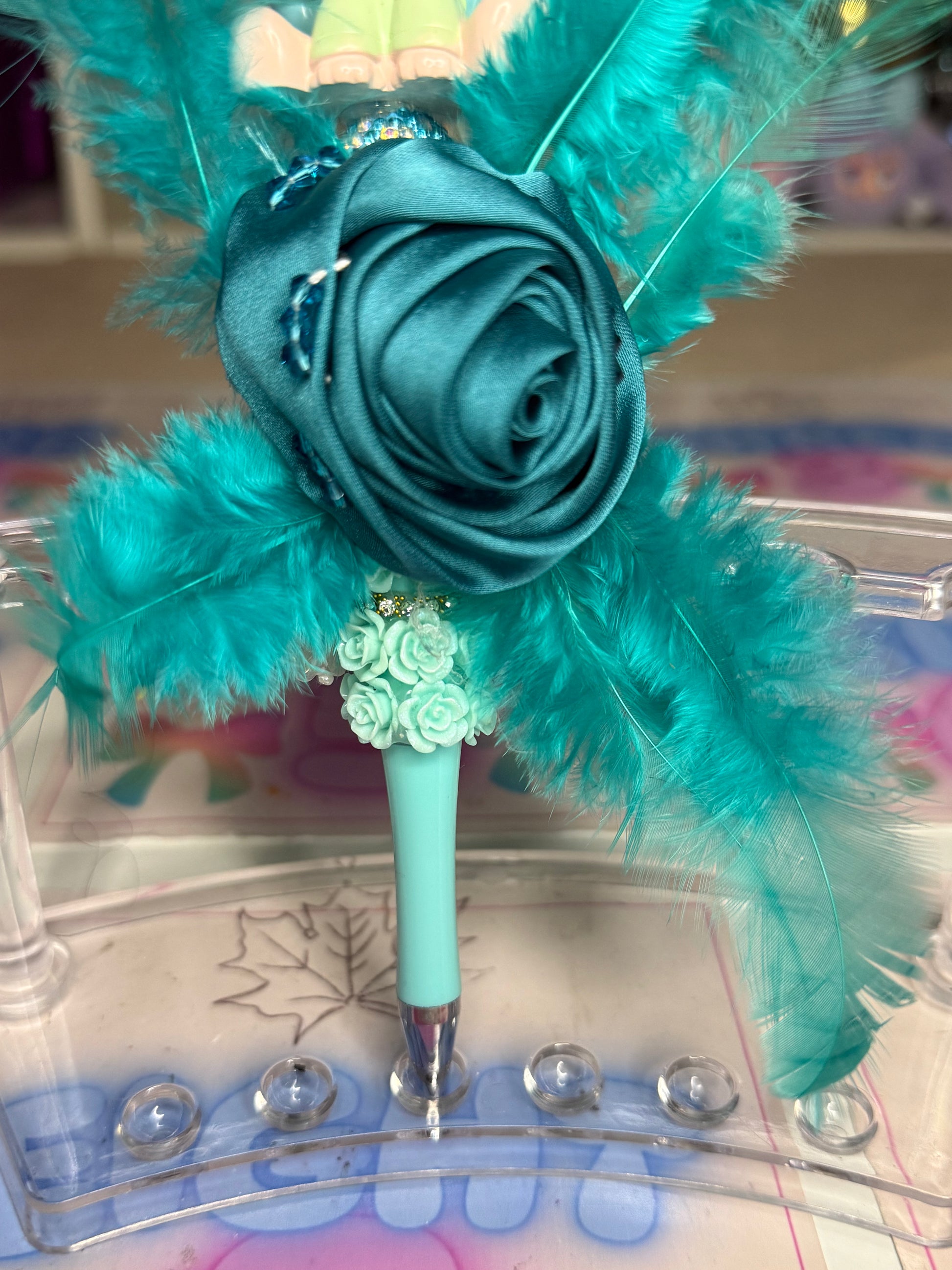 She sits on a Pastel Green Pen Barrel with a cluster of green roses centred by a large satin rose and surrounded by feathers.