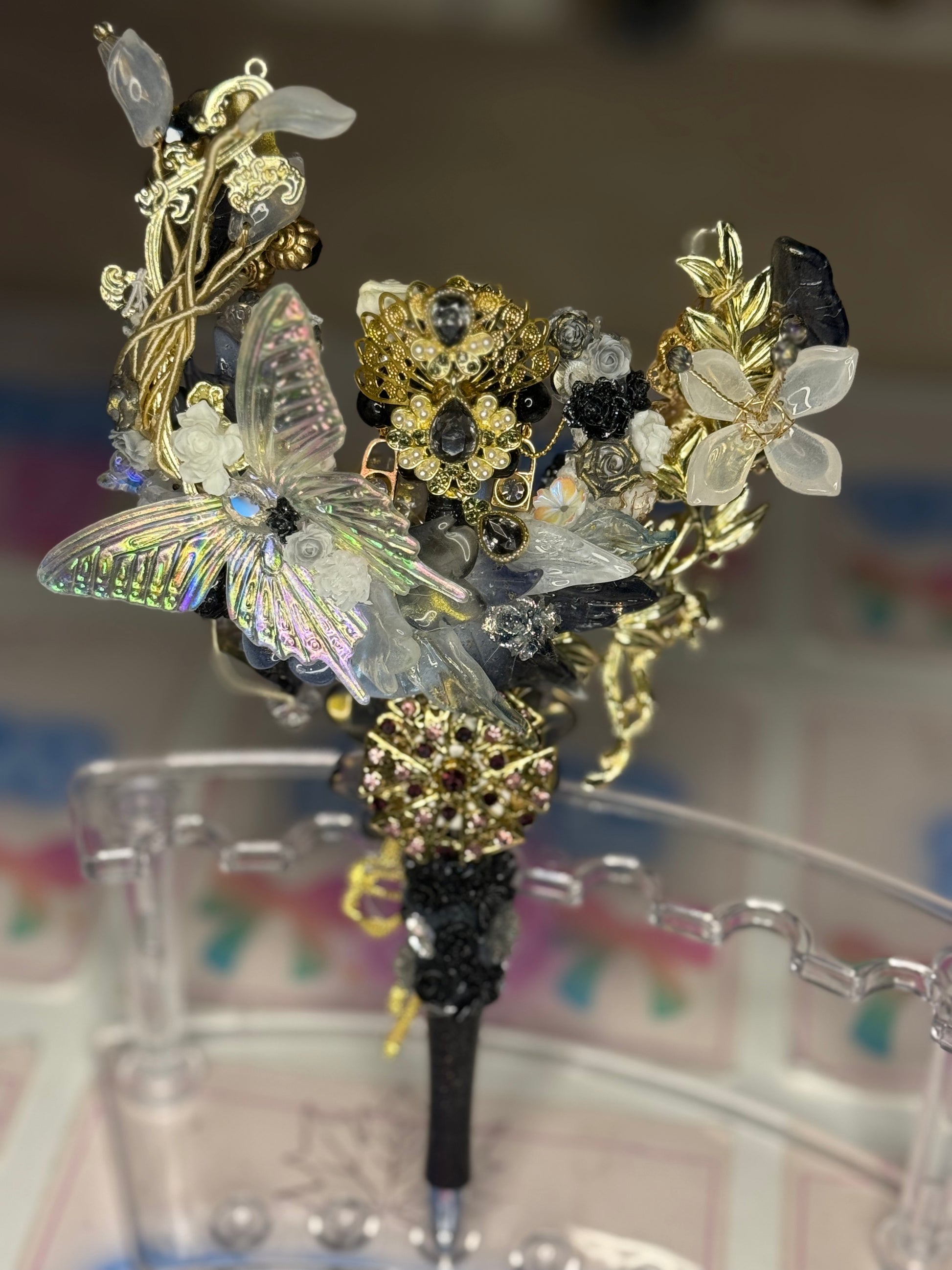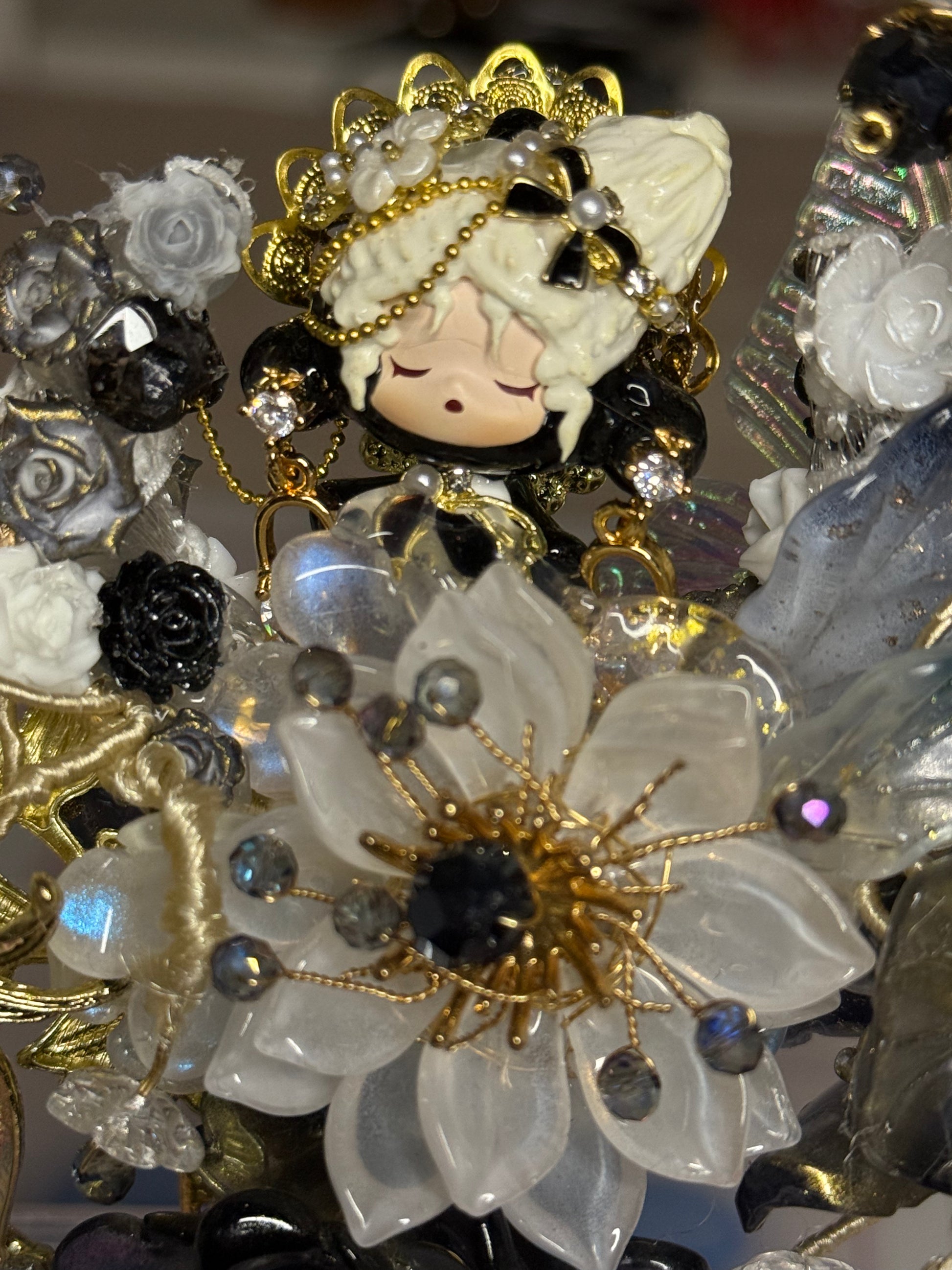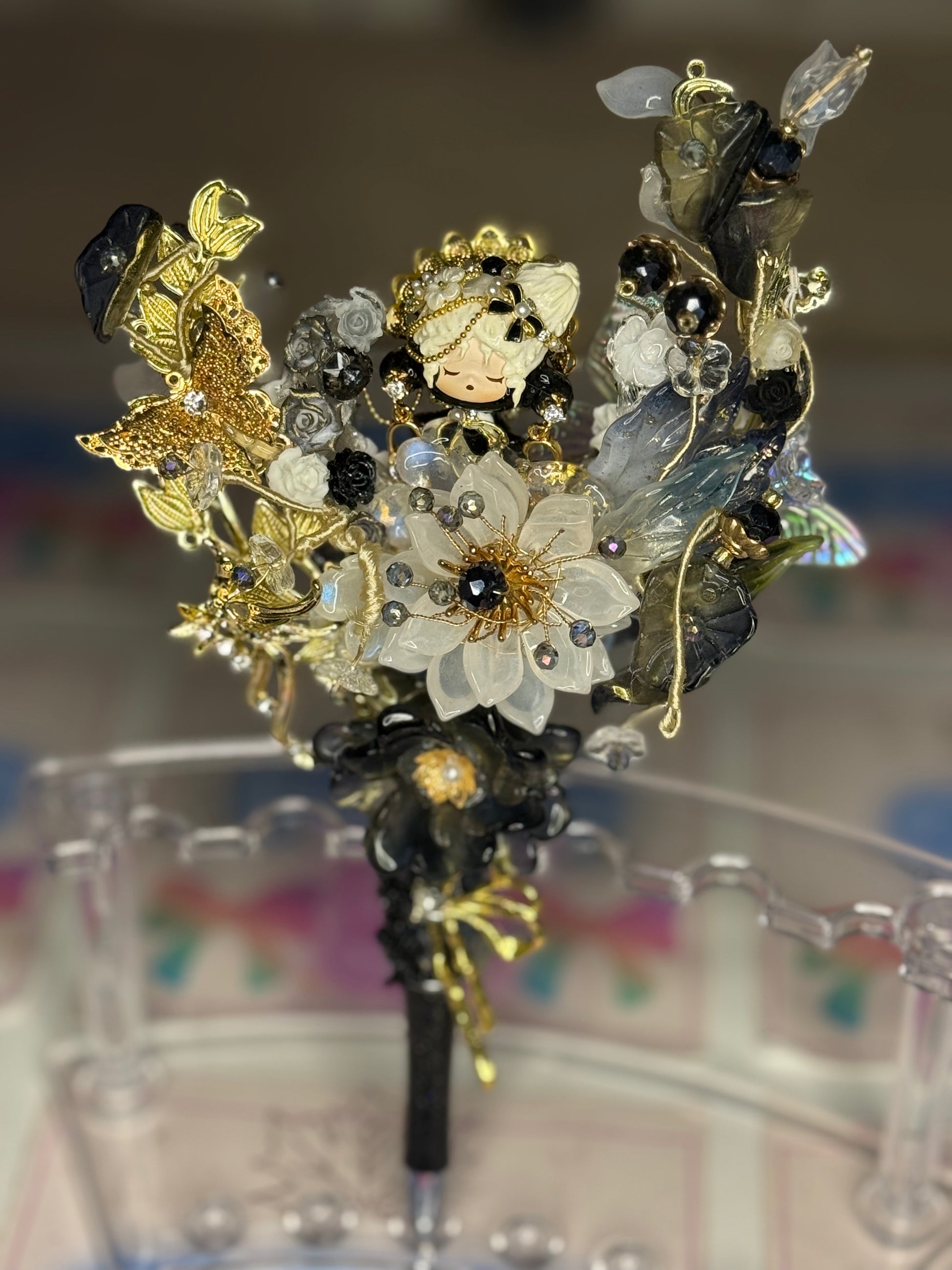 She sits on a Black Pen Barrel with a cluster of black roses and surround by glass flowers and Gold Metal detailing